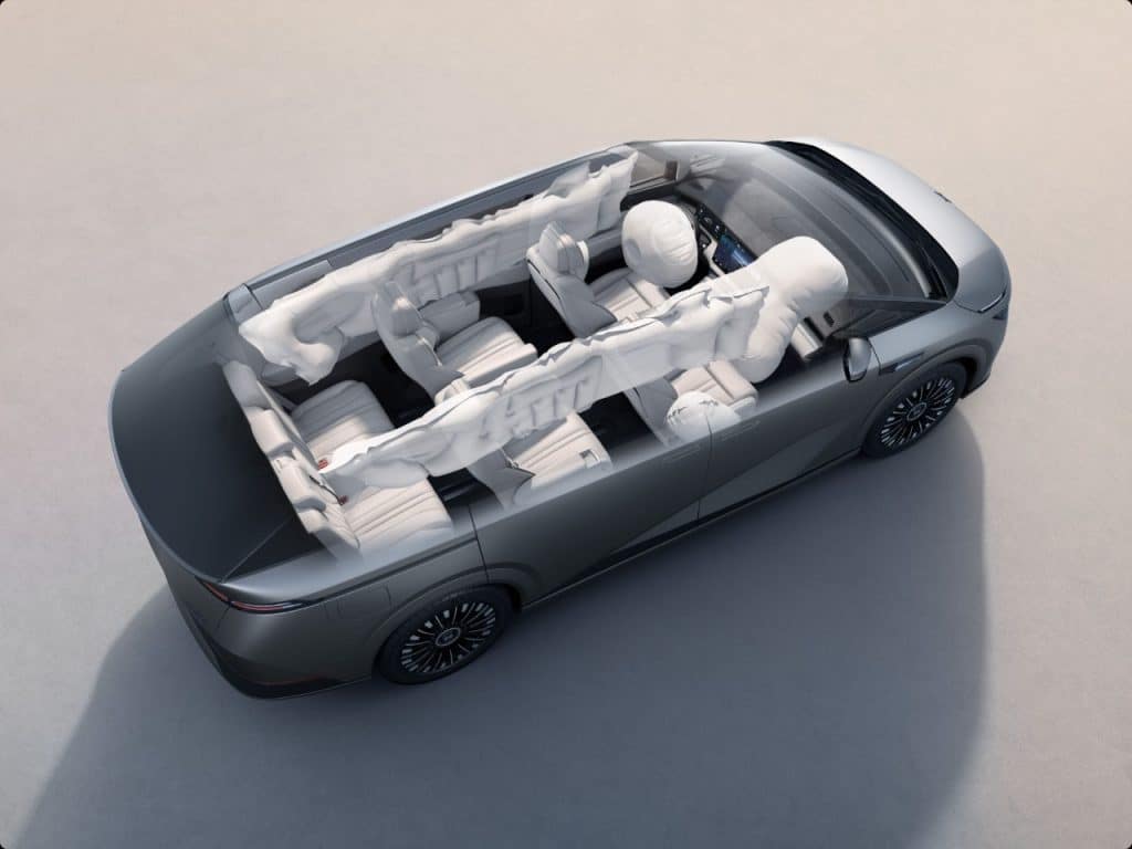 The cabin uses nine airbags and the largest energy-absorption zones in its class.