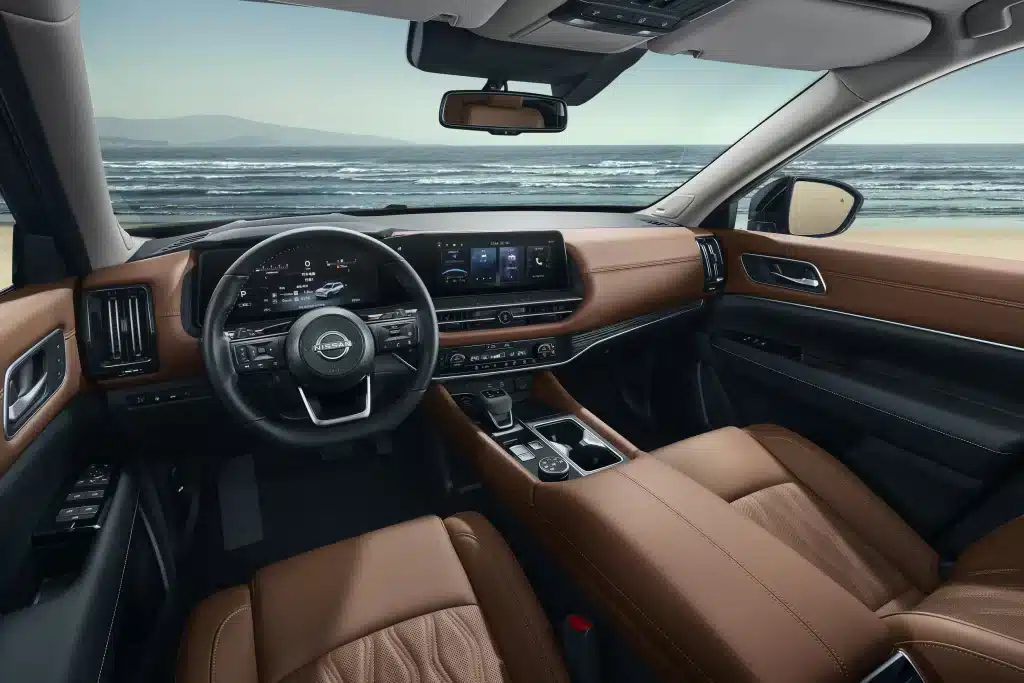 Inside the cabin, the Nissan Pathfinder combines modern displays with practical physical controls. The center console and digital instrument cluster both feature 12.3-inch screens. The digital cluster displays driving data clearly, including speed, range, and safety-related information.