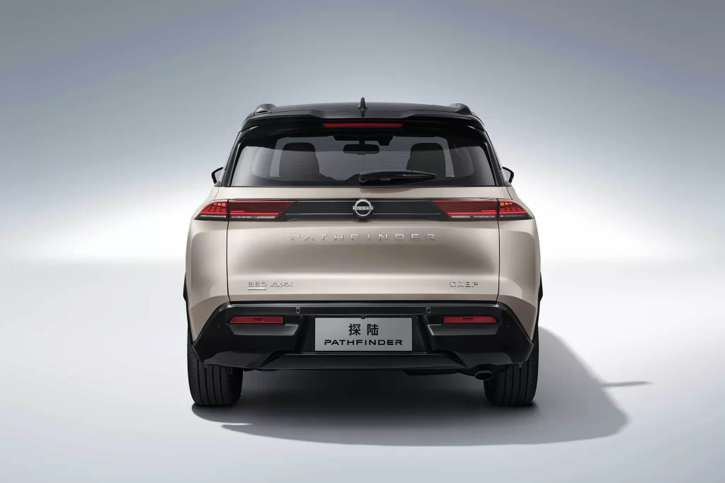 At the rear, the Pathfinder features a full and robust tail design. The taillights are visually connected by a dark trim panel, creating a continuous lighting effect. The central Nissan badge and English model lettering improve recognition.