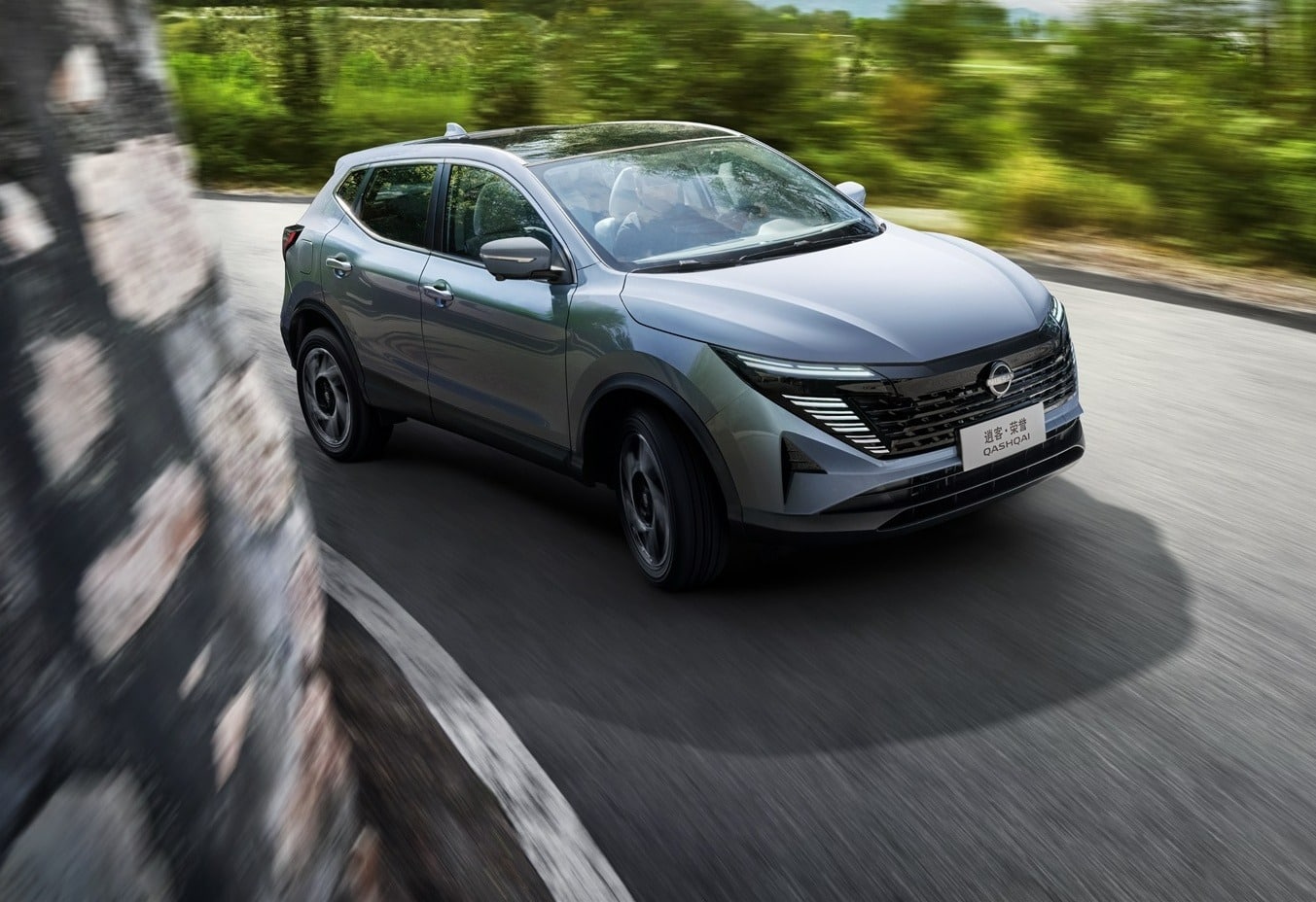 The Nissan Qashqai features the familiar V-Motion front design language. The inverted trapezoidal grille is decorated with silver trim, enhancing its sporty appeal. Angular headlights integrate seamlessly with the grille, visually widening the front fascia.